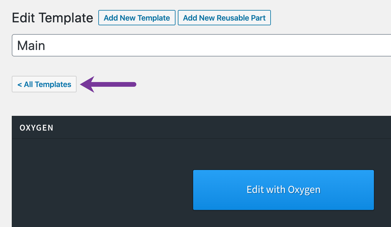 Adds a link to go back to the Templates list screen when editing a Oxygen Template. Clicking the button will take you back to Oxygen > Templates screen.